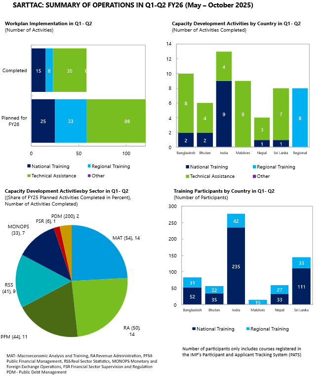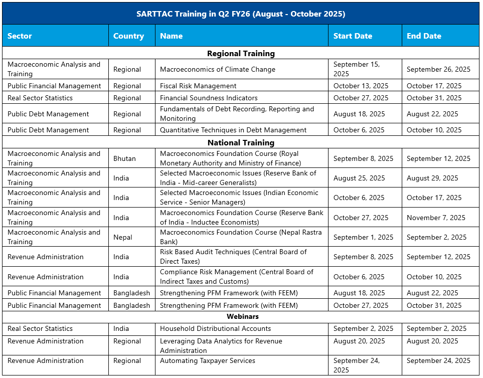 Webinar on Household Distributional Accounts (September 2, 2025)During the second quarter of FY26, SARTTAC delivered a wide range of training activities across all workstreams. This comprised 14 training courses and workshops, of which 5 regional trainings – in which officials of all SARTTAC MCs were represented - and 9 national training courses dedicated to officials of a specific country: