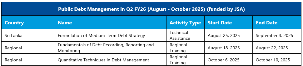 - Two new regional training courses were delivered, focusing on public debt management. The first training focused on the Fundamentals of Debt Recording, Reporting and Monitoring (August 18-22, 2025) and the second on Quantitative Techniques in Debt Management (October 6-10, 2025) [Read More].