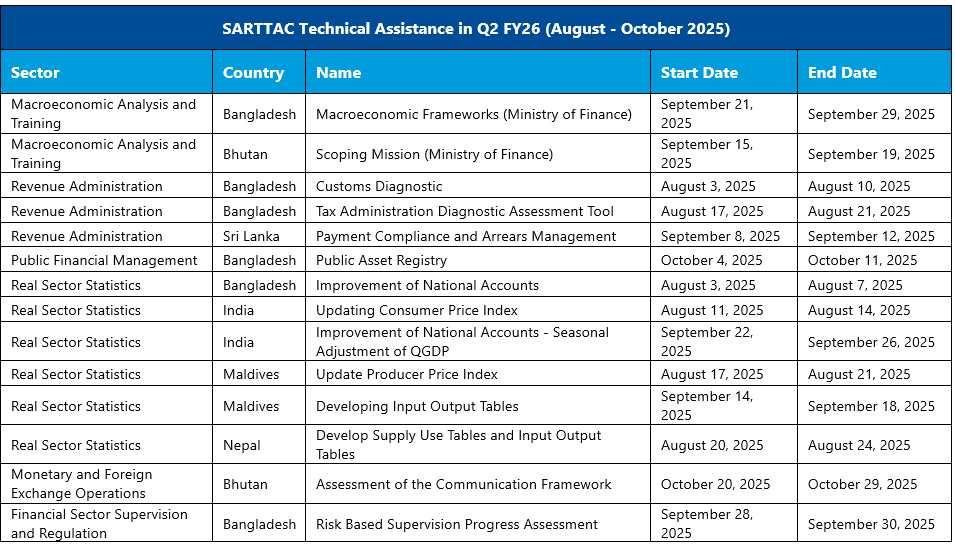 In the second quarter of FY26, SARTTAC engagement with MCs strengthened the compilation and dissemination of GDP data according to international statistical standards and updating price indexes. SARTTAC delivered six TA missions to four of its MCs: