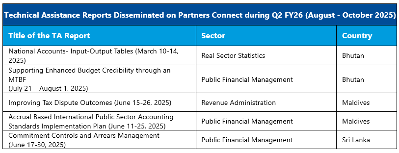 - Cross-regional webinars on digital transformation in revenue administration were delivered. The cross-regional webinar series on digital transformation in revenue administration continued, with about 100 tax and customs officials from 16 member countries across SARTTAC, Pacific Financial Technical Assistance Centre and Caucasus, Central Asia, and Mongolia Regional Capacity Development Center. Webinars on Leveraging Data Analytics for Revenue Administration (August 20, 2025) and Automating Taxpayer Services (September 24, 2025) were delivered.